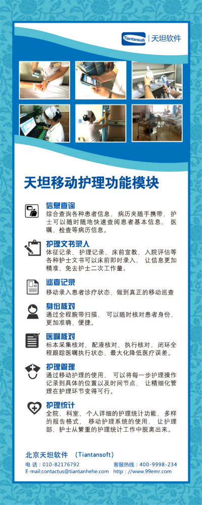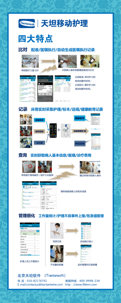 天坦移動護(hù)理系統(tǒng)改變傳統(tǒng)護(hù)理工作模式。將審藥、配藥、治療等環(huán)節(jié)實現(xiàn)移動化、條碼化、共享化。確保信息準(zhǔn)確,用藥安全;系統(tǒng)將護(hù)理工作變得更方便、更自由,護(hù)士可以在任何地點(diǎn)調(diào)取病歷、化驗報告、檢查影像,利用各種移動終端完成醫(yī)囑執(zhí)行、床前護(hù)理文書錄入等護(hù)理操作,極大地減少護(hù)理管理人員的工作量,提高整個護(hù)理工作的工作效率與醫(yī)療質(zhì)量。