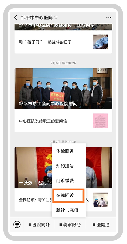 微信公眾號搜索:鄒平市中心醫(yī)院,或掃描醫(yī)院二維碼,關(guān)注公眾號。